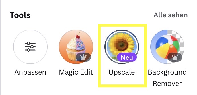 Das Tool Image Upscaler gab es schon relativ lange, war aber bisher eine Dritttanbieter-App, die die Bildbearbeitungstools ergänzt haben. Jetzt gehört es anscheinend zum regulären Canva Stack.