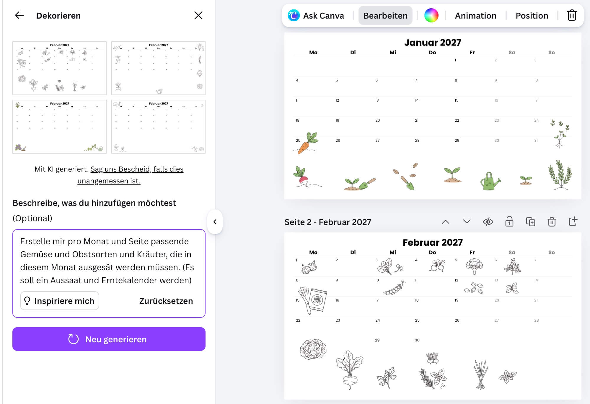 Ich hab das Mal getestet und das Ergebnis ist jetzt für jede Seite einzeln gesprochen ganz nice. Passt aber weder ganzheitlich zueinander, noch ist es easy umgesetzt. Die Icons für meinen Aussaatkalender sahen bei jeder Folie anders aus und ich musste die Grafiken auch für jede Seite einzeln erstellen lassen. (Das wäre dann schon eher ein Einsatz für die Canva AI 2.0)