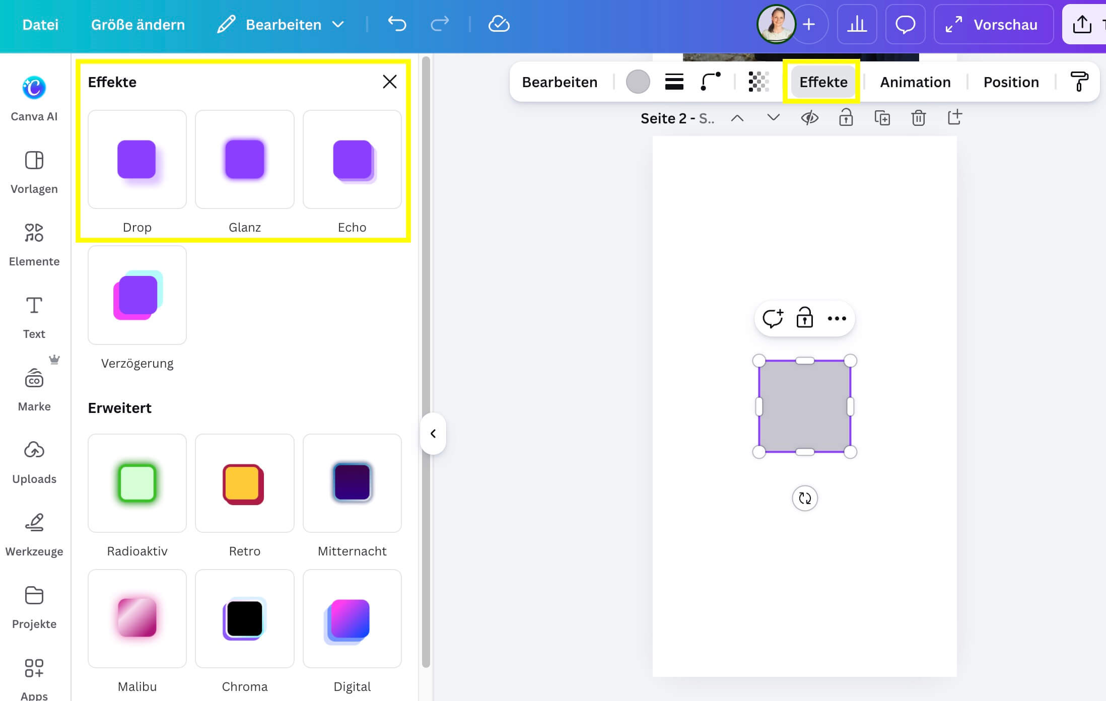 Du kannst bei deinen Formen (also wenn du ein Rechteck einfügst oder einen Kreis) jetzt auch Schatten oder andere Effekte hinzufügen. Super nice!!!