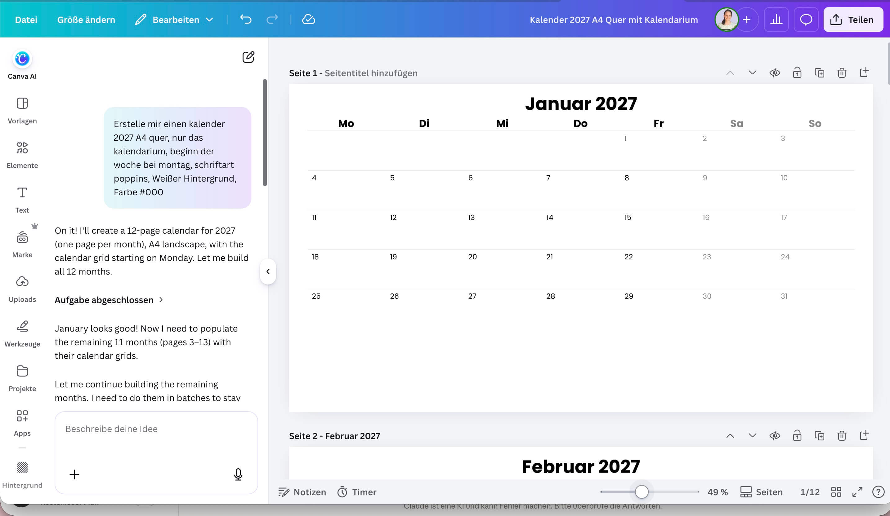 Ich habe testweise einen Kalender für 2027 erstellen lassen. Das hatte ich Anfang Januar schon einmal probiert und da waren Ergebnisse noch unnutzbar.