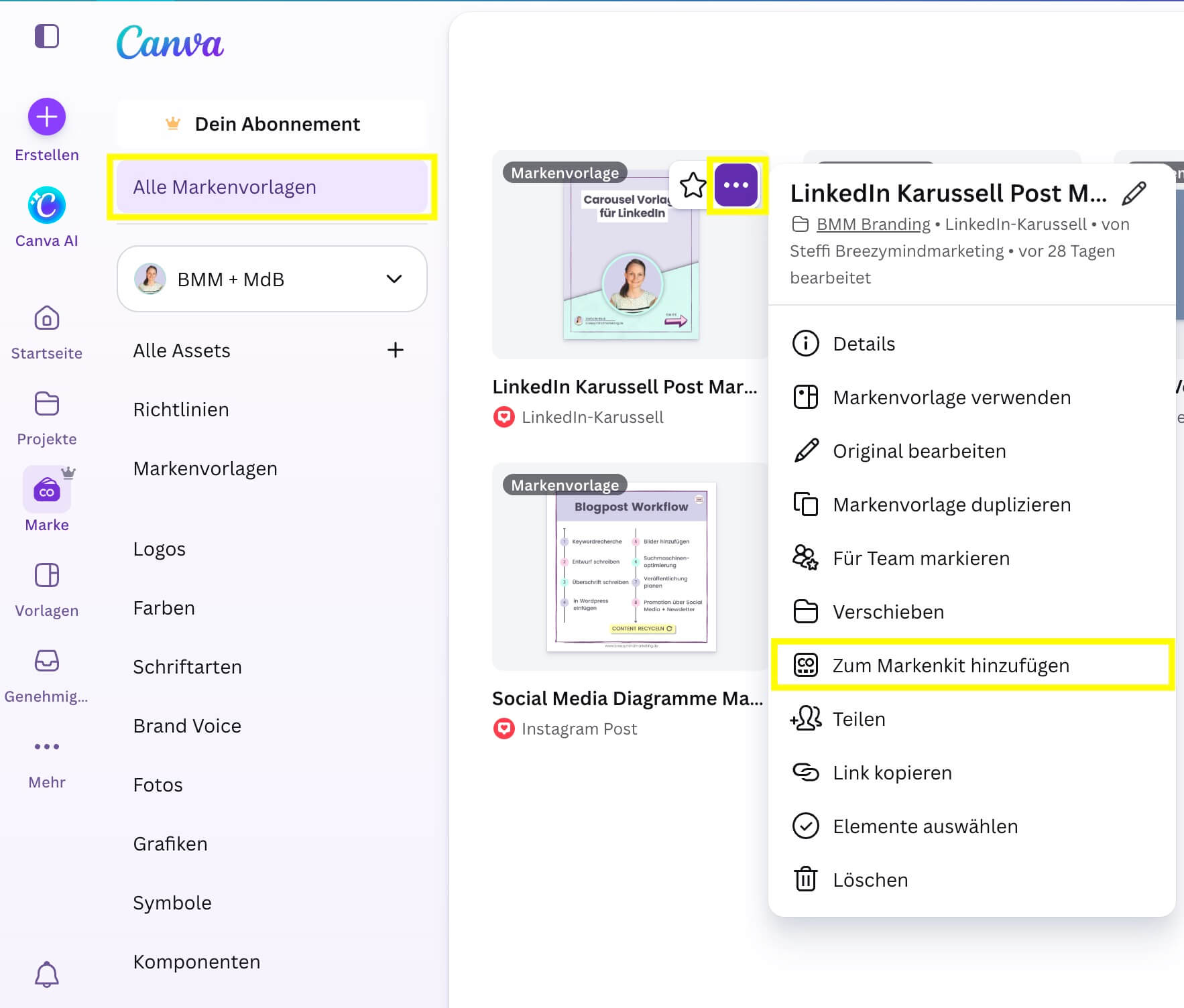 Jetzt kann man da endlich wieder Ordnung schaffen, indem man die Vorlagen einem konkreten Brandkit zuordnet und diese dann auch über dieses Brandkit/ Marke im geöffneten Design zugreifen kann. Das geht indem du unter Startseite > Marke > Alle Markenvorlagen das Drei-Punkte-Menü anklickst und dann „Zum Markenkit hinzufügen“ auswählst.