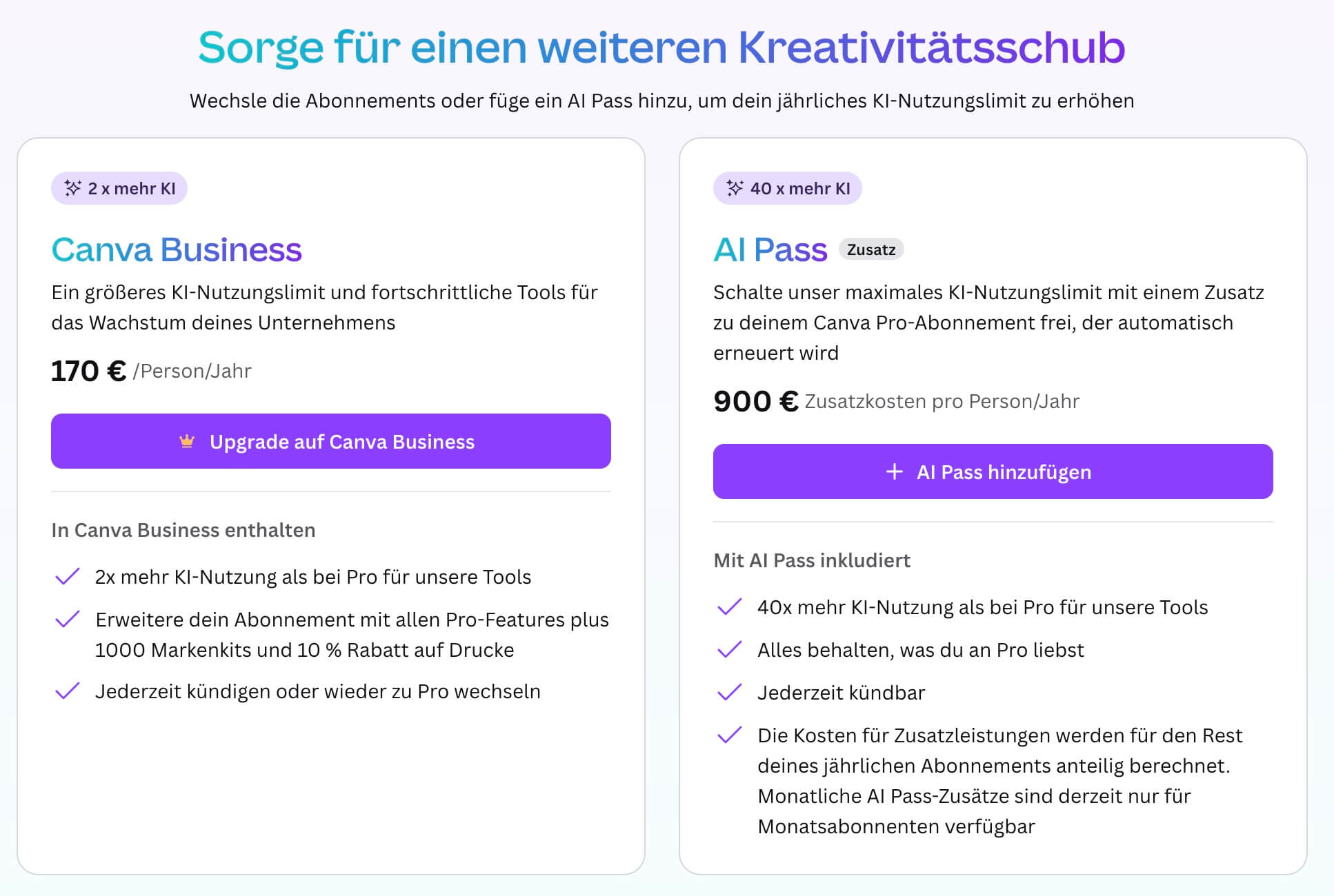 Den KI-Pass kannst du nur einmal kaufen. Wenn du damit ans Limit stößt, muss bis zum nächsten Reset warten oder auf einen höheren Plan upgraden. Verfügbar ist der KI-Pass für Canva Pro, Teams, Business und Nonprofit-Abos.