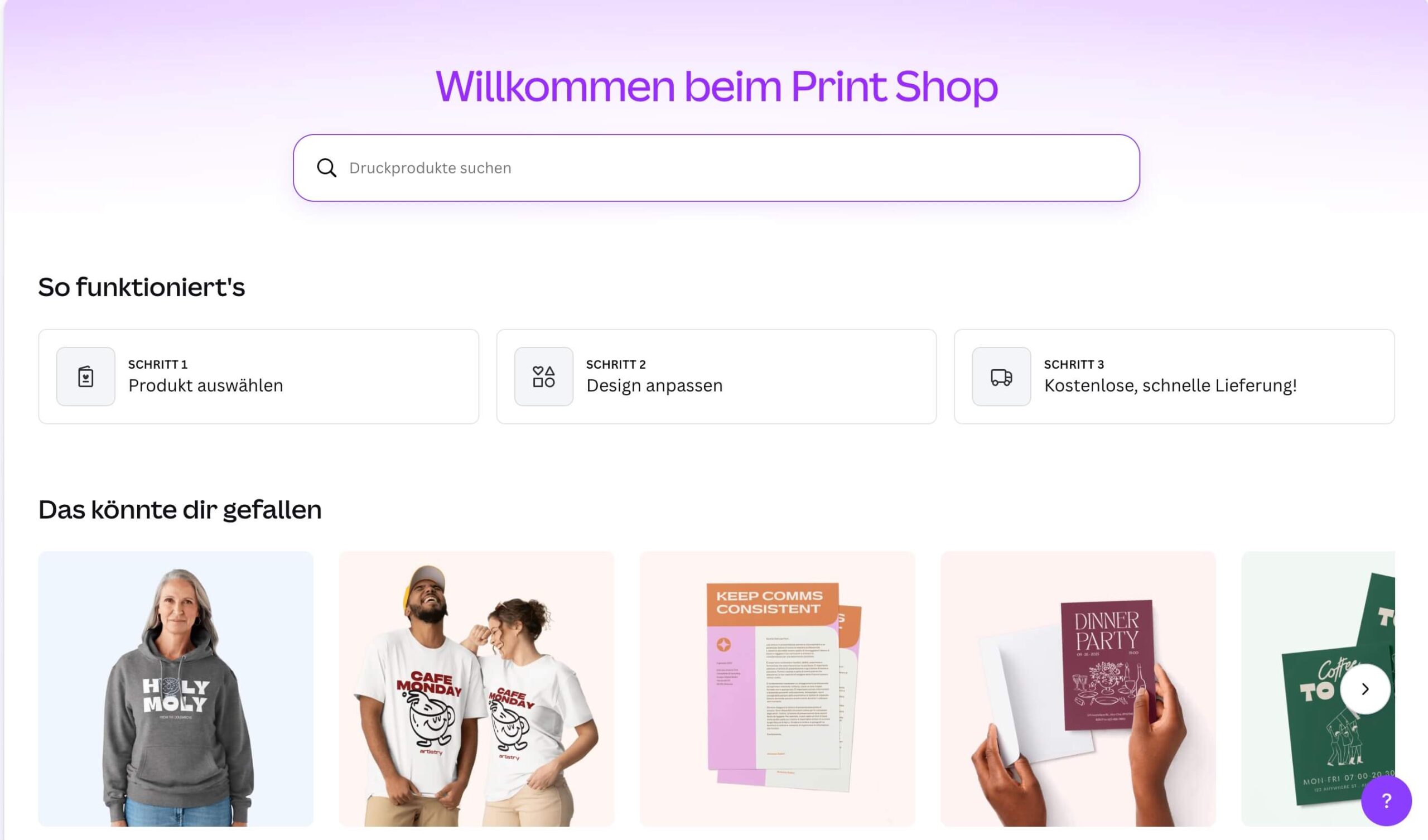 Ähm ja, also den Print Shop gab es schon die ganze Zeit 🙄. Hieß nur bisher nicht Print-Shop. Damit kannst du T-Shirts, Visitenkarten, Sticker usw. direkt über Canva erstellen und Drucken lassen.