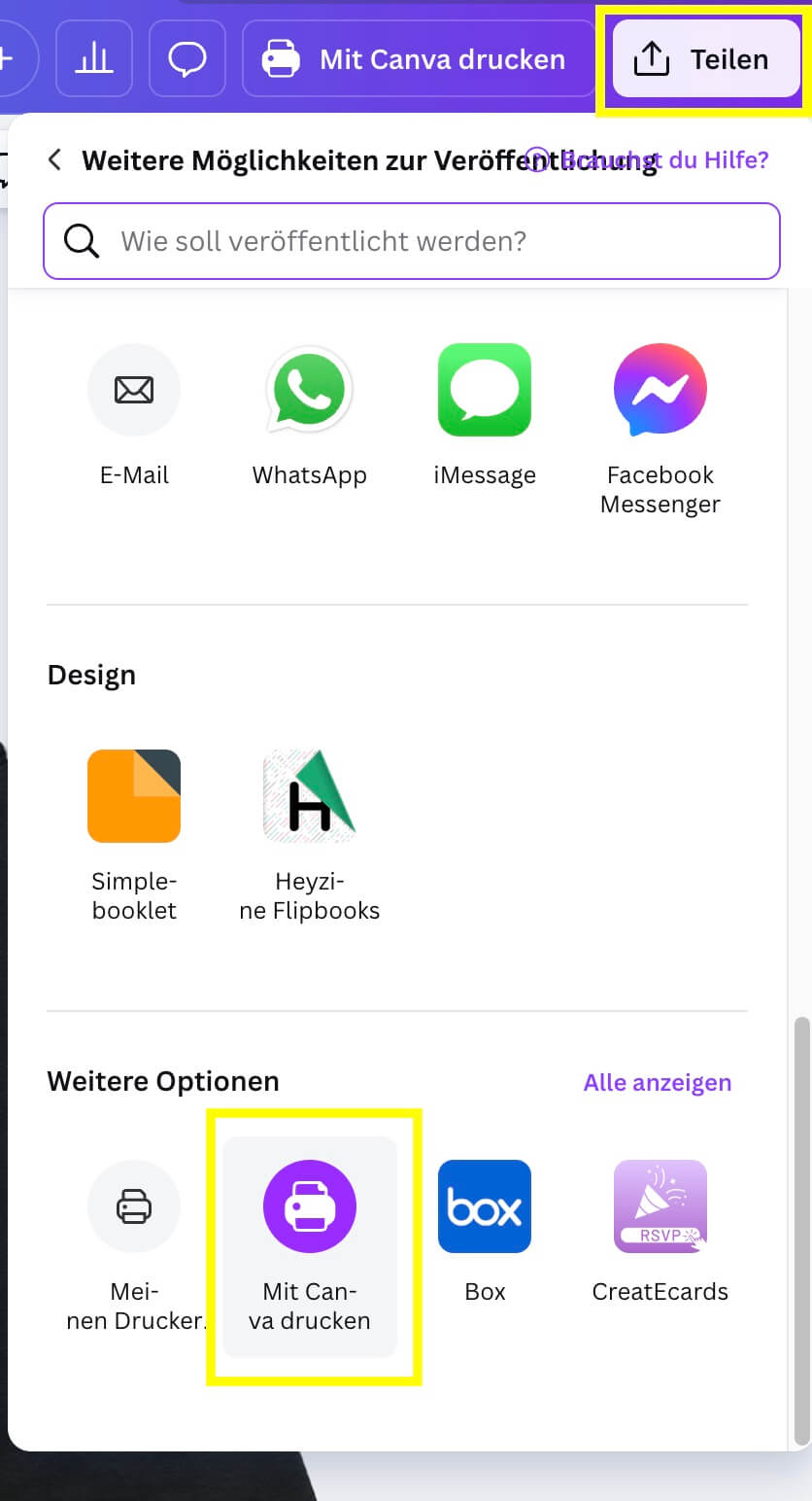 Designs werden ganz normal in Canva designt, der Druck ausgelöst wird dann über das Auswahlmenü auf der rechten Seite oder alternativ über das Teilen-Menü > Alle Anzeigen > Weiter Optionen > Über Canva Drucken.