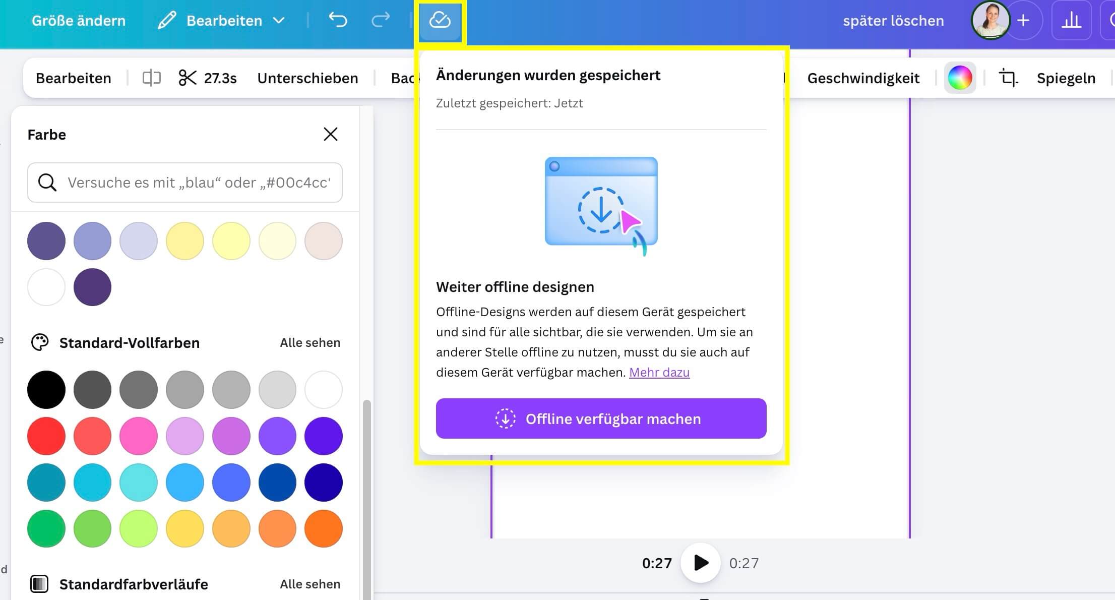 Damit du dein Design offline bearbeiten kannst, musst du es vorher aktiv „offline“ machen. Das kannst du indem du das Synchronisations-Icon in einem geöffneten Design anklickst und dann den „Offline verfügbar machen“-Button klickst.