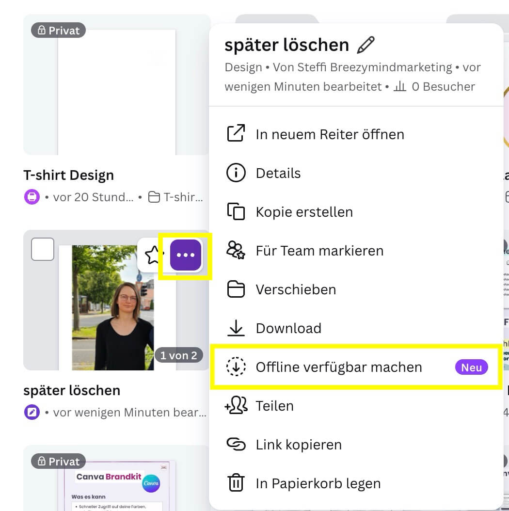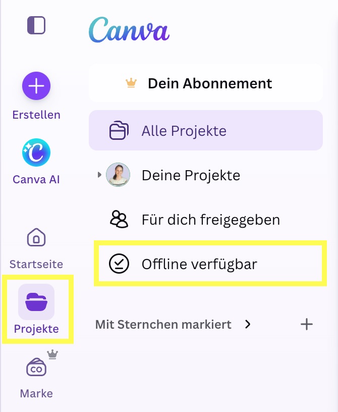 Zugriff auf deine Offline Designs bekommst du unter Projekte > linke Seitenleiste > „Offline verfügbar“ klicken
