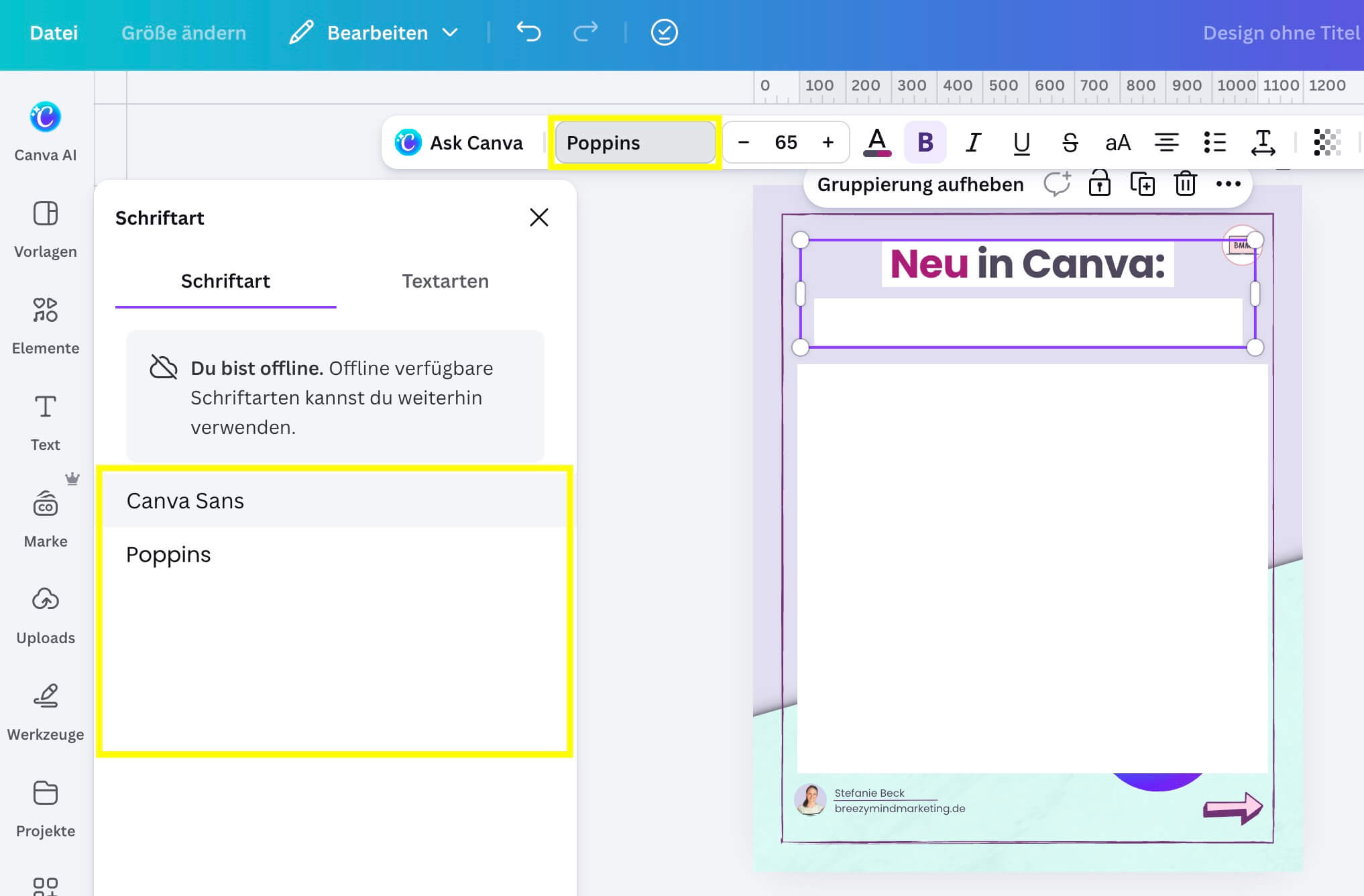 Wer offline editieren will und seine Brandfarben, Schriftarten oder Bilder dabei benötigt, muss diese vorher ins Design hinzugefügt haben, da es darauf im Offline Modus kein Zugriff mehr gibt. Was die gesamte Funktion an sich so ein bisschen fürn Pops erklärt. Auch dass man keine neuen Designs erstellen kann, sondern essentiell gerade mal das, was da ist, minimal anpassen kann, macht es für mich zu keiner empfehlenswerten Funktion.
