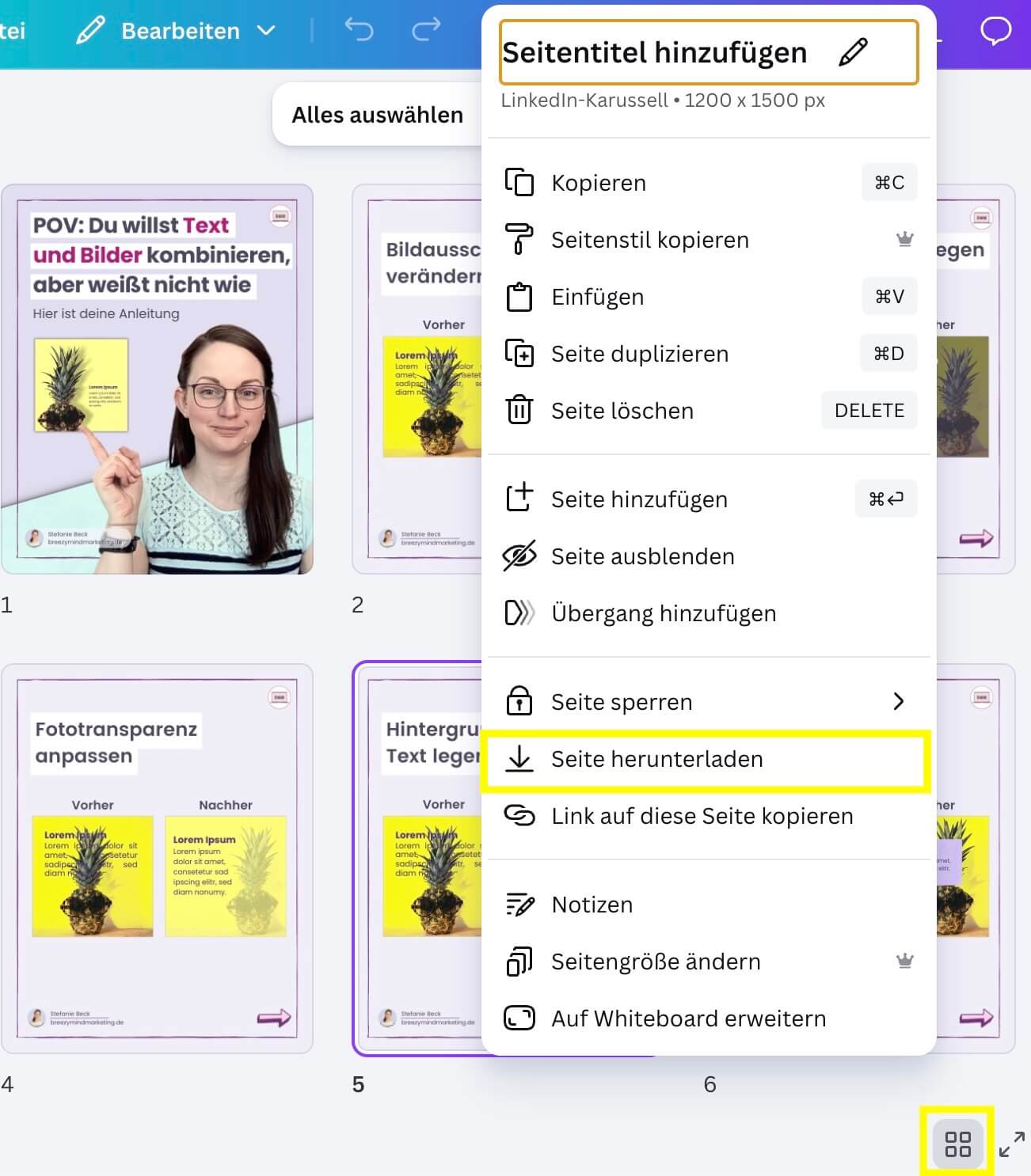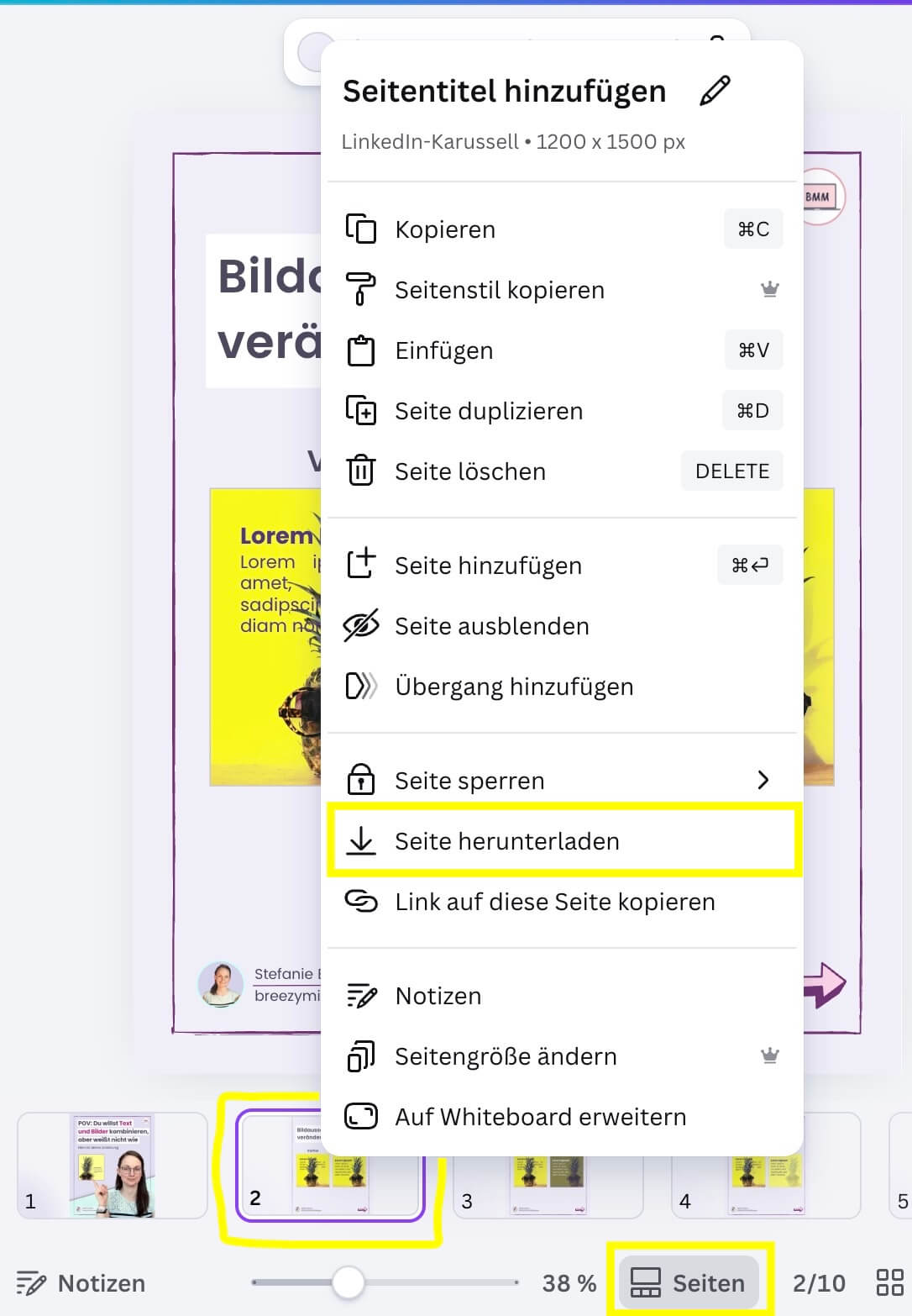 Jetzt kannst du die Abkürzung nehmen. Einfach per Rechtsklick auf die Folie klicken und ein Menü öffnet sich. Dort findest du den Punkt „Seite herunterladen“, kannst dann wie gehabt Format, Größe und Zusatzeinstellungen vornehmen und die Einzelseite schnell downloaden.
