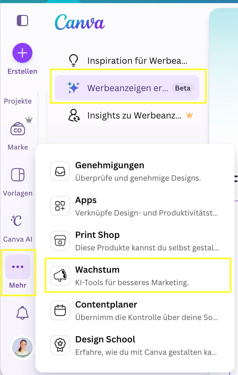 Aktuell ist CanvaGrow noch in der Beta-Version (Linke Seitenleiste > Wachstum).