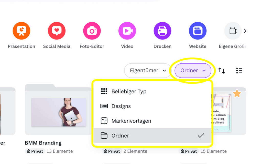 Wenn du also etwas bestimmtes suchst, und bereits weißt, dass es ein Ordner oder eine Markenvorlage ist, kannst du das besser filtern. Je nach Anzahl deiner vorhandenen Designs musst du dann ggf. trotzdem noch eine weile Scrollen, aber: Ich halte das für einen guten ersten Schritt zu mehr Übersicht auf der Startseite!