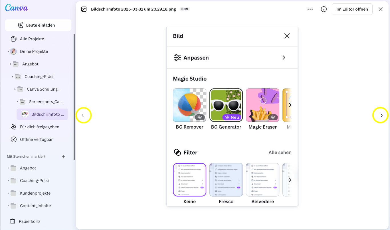 → Die Startseitenansicht in Canva verändert sich regelmäßig. Deine Ordnerstruktur nicht. Die hast du selbst in der Hand, ohne von der aktuellen Dashboardansicht abhängig zu sein.
