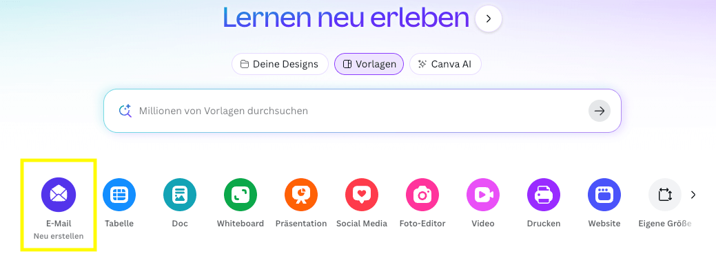 Als neuen Inhaltstyp präsentiert uns Canva die Möglichkeit E-Mails zu erstellen. Auch wenn es schon vorher möglich war, E-Mails in Canva zu erstellen, war es vermutlich eine eher selten genutzte Funktion.
