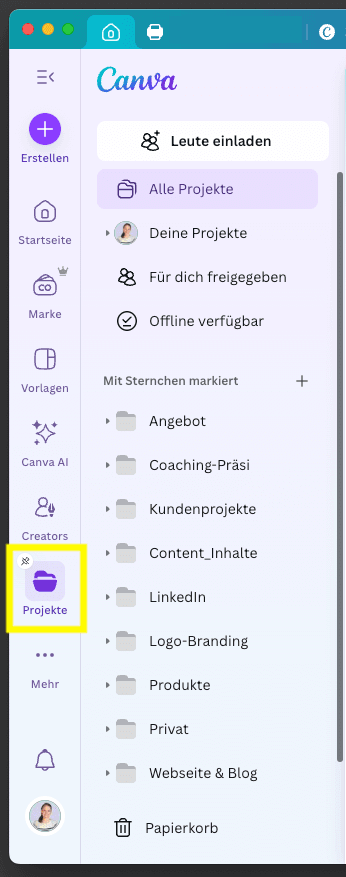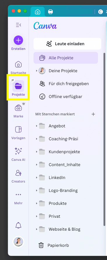 → Die Startseitenansicht in Canva verändert sich regelmäßig. Deine Ordnerstruktur nicht. Die hast du selbst in der Hand, ohne von der aktuellen Dashboardansicht abhängig zu sein.