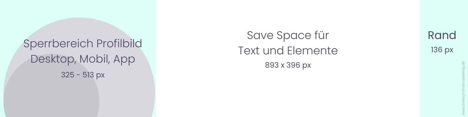 Oberhalb der Sperrzone für dein Profilbild ist noch etwas Platz für dein Logo, einen Slogan oder Claim oder eine Handlungsaufforderung (CTA). Hier kannst du bspw. auf deinen Fokusbereich verweisen oder den Link in deinem Profil, deine Website oder Terminbuchungsapp. Kurz und knackig ist hier die Devise.