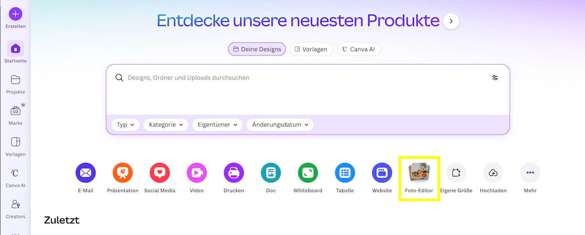 Der Canva Fotoeditor war bisher eine eher versteckte Funktion, die du nur über den Upload-bereich aufrufen konntest. (In diesem Video vom letzten Jahr habe ich die Funktion erklärt). Jetzt kannst du den Foto-Editor direkt über die Startseite aufrufen und deine Bilder bearbeiten, ohne ein extra Design erstellen zu müssen.