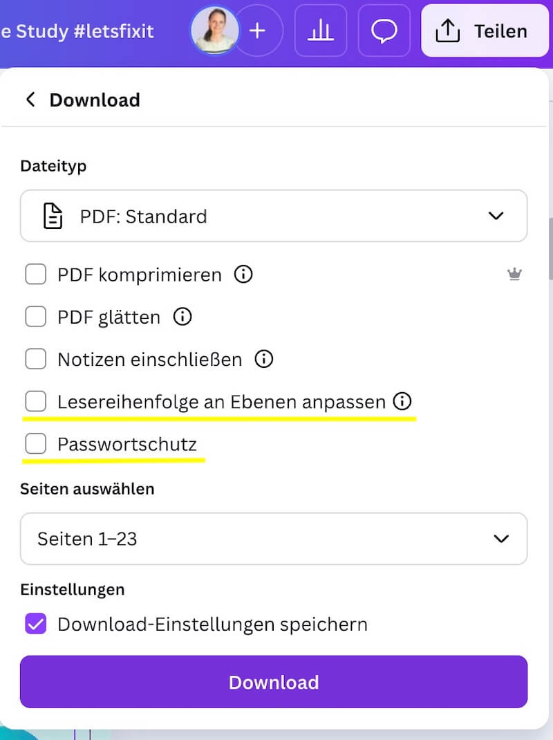 Wenn du PDFs downloaden möchtest, gibt es nun auch die Möglichkeit einen Passwortschutz einzurichten, die Lesereihenfolge an die Ebenen anzupassen und deine Notizen mit zu exportieren. Gerade letzteres finde ich eine interessante Funktion, wenn du bspw. Präsentationen runterlädst. (Ich glaube, die Notizen-download-Funktion gab es vorher auch schon, oder?!)