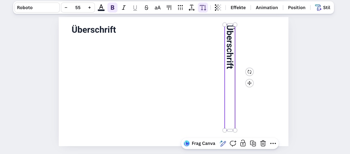 Dort gab es auf einmal die Funktion „vertikaler Text“. Ich habe nun versucht, die Funktion in einem neuen Canva Dokument zu reproduzieren, aber kein Glück. Diese Funktion gibt es wirklich nur in dem importierten PowerPoint Dokument. Witzigerweise drehen sich nach Klick dann auch einige Symbole der Werkzeugleiste.
