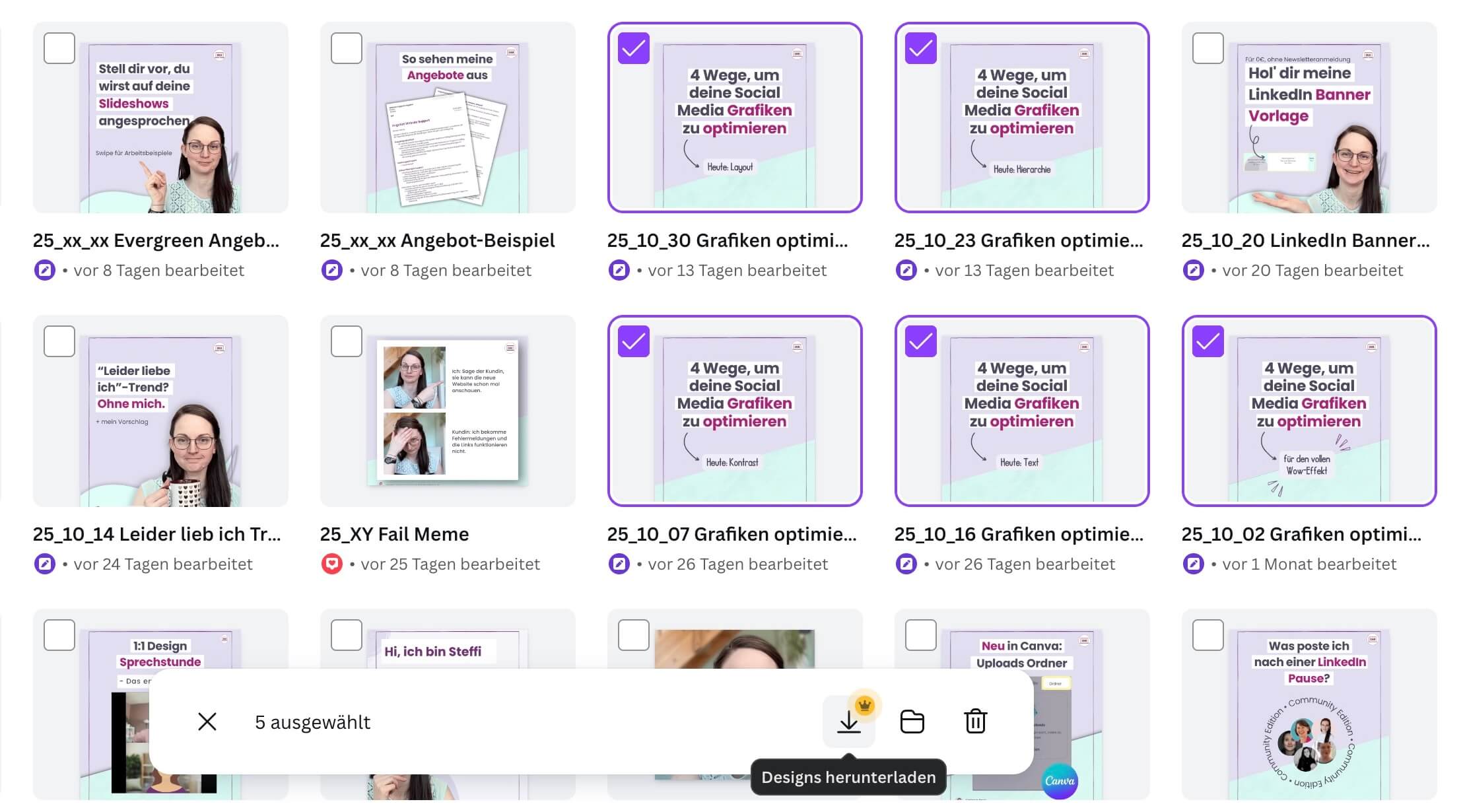 Wähle dafür die entsprechenden Designs aus. Am Bildschirmende erscheint ein Menü. Dort kannst du dann auf Download klicken und es lädt dir deine Designs runter. (Pro Funktion)